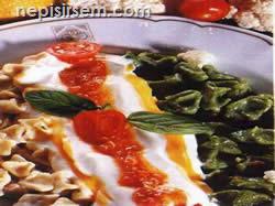Not: Şayet marketlerde hazır olarak satılan fesleğen sos bulunamazsa aşağıdaki tarife göre yapılabilir. 50 gr dövülmüş ceviz içi 50 gr dövülmüş fındık içi 2 diş sarımsak (ince kıyılmış) 1 kahve fincanı sıvı yağ Yeterince tuz ve biber 1 kahve kaşığı kıyılmış taze fesleğen Bu malzemeyi iyice karıştırarak sosu hazırlayabilirsiniz.
