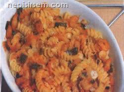 Bu arada makarnayı yapmak için büyükçe bir tencereye kalan 10 su bardağı su ile kalan 1 tatlı kaşığı tuzu koyup harlı ateşte kaynatınız. Kaynayınca ateşin altını kısıp, makarnayı katarak 8-10 dakika makarna iyice yumuşayıncaya kadar pişiriniz. Tencereyi ateşten alınız. Makarnayı kevgirden süzüp üstünden sıcak su geçirerek ısıtılmış bir servis tabağına boşaltınız. Kalan 4 çorba kaşığı yağı ekleyip iki büyük kaşıkla makarnayı karıştırarak yağı yediriniz.