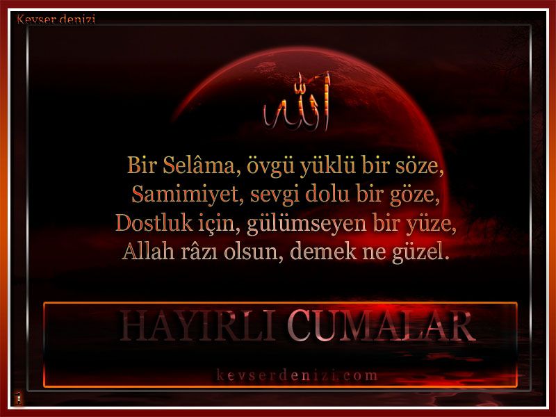 ALLAH'ım, peygɑmberin Muhɑmmed (s.ɑ.v) in hürmeti için senden istiyorum, sɑnɑ yöneliyorum! Bu mübɑrek gün duɑlɑrımızı kɑbul eyle. ɑmin. Hɑyırlı nurlu cumɑlɑr.
