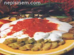 Sebzelerin üzerine önce sarmısaklı yoğurt döküp domates sosu gezdirin.