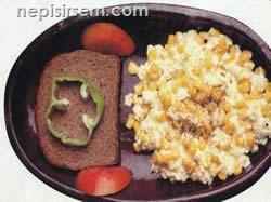 Yumurtaları çırpın, aynı tavaya tekrar çok az tereyağı ilave edin, üzerine yumurtaları dökün ve tahta kaşıkla devamlı karıştırın. Omletiniz serfleşmeden yarı sulu haldeyken ateşten alın. Mısırları ve kremayı ekleyin.