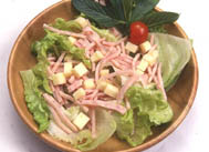 Jambonları uzunlamasına, ince şeritler halinde kesin. Peynirleri de tavla zarı formunda doğradıktan sonra, marulların üzerine ekleyin. Limon suyu, zeytinyağı ve tuzu karıştırarak sosu hazırlayın ve salatanın üzerine gezdirin. İnce kıyılmış maydanoz ve dereotuyla süsleyerek servise sunun.
