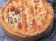Tereyağını eritin, un ilave edin, pembeleşene kadar kavurun. Tavuk suyu, süt, karabiber ve tuz koyup karıştırarak pişirin. Kaynamaya başlayınca içine küçük küçük doğradığınız tavuk göğüs etini, bezelye ve mısırı koyup ocağı kapatın. Soğuduktan sonra kaşar peyniri ve krema ilave edin.