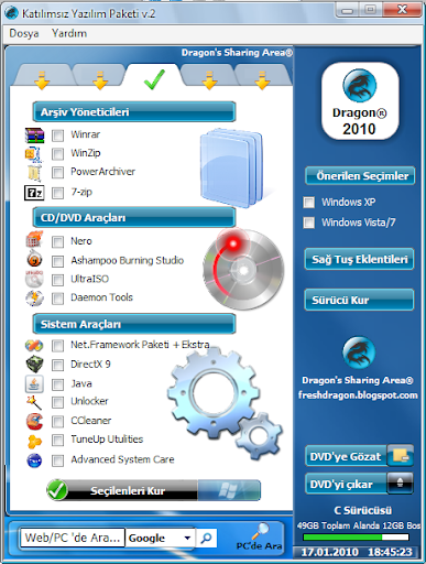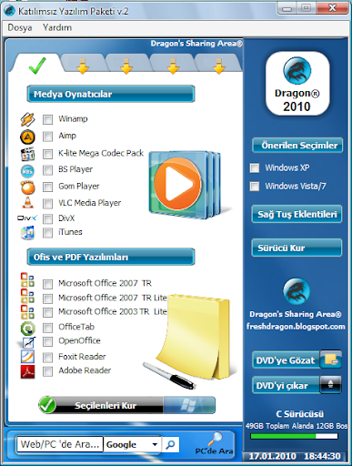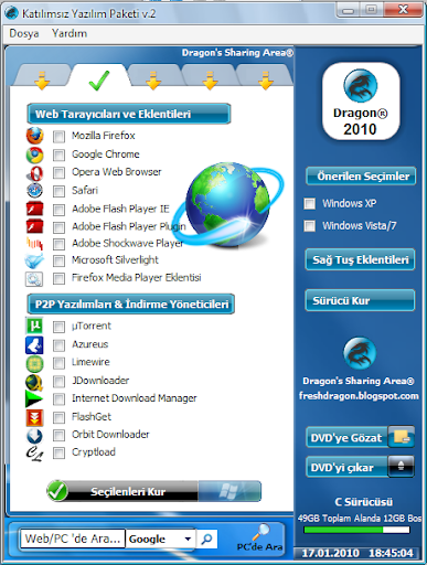 Sonunda tamamladım.Aslında çok daha önce çıkarmayı planlıyordum fakat çok yoğun bir dönem geçirdim ve çıkarmışken en güzel halini oluşturmalıyım dedim.İşlev olarak önceki sürümden fazla bir farkı yok seçip kuruyorsun farklı olarak birkaç özellik birkaç Kayıt Defteri ayarı Tema vs.Bu çalışmada Tasarıma öncelik verdim.Uygulamanın Dosya menüsündeki Yorum Gönder kısmında istek, öneri ve çalışma hakkındaki görüşlerinizi bildirebilirsiniz.Ayrıca Dosya menüsündeki Lisans kısmından da Windows 7 ve Windows XP için Aktivasyonlar bulabilirsiniz.
