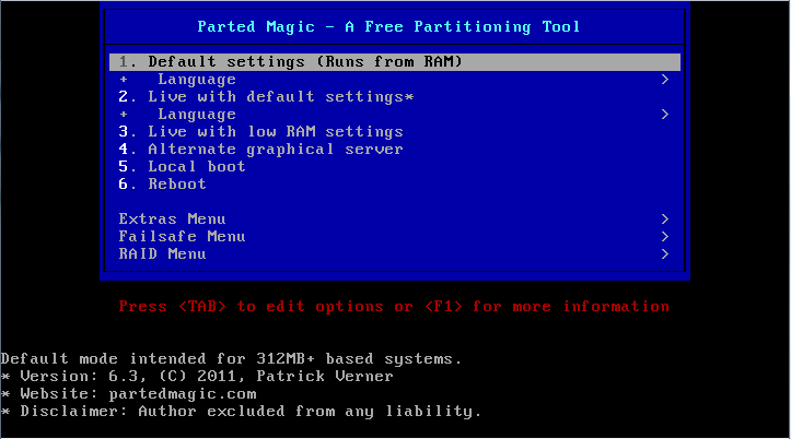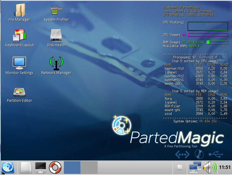 Parted Magic requires at least a i586 processor and 256MB of RAM to operate or 128MB in "Live" mode.