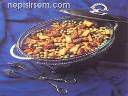 Tepsideki köftelerin üzerine dökerek pişirin. Patates ve bezelyeleri de ilave ederek 2-3 dakika daha pişirdikten sonra servise sunun.